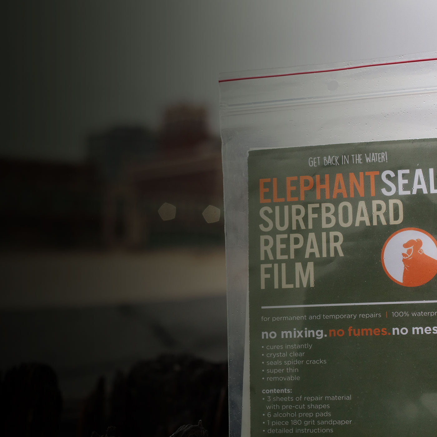 Elephant Seal Surfboard Repair Film kit has everything you need to quickly, easily make dings and cracks in your surfboard completely watertight. The heavy-duty packaging keeps everything dry and protected and ready to go.